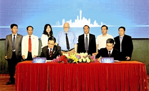 区委副书记、区长楼旭逵(前右)与全球CEO俱乐部中国区主席李京平先生(前左)分别代表番禺区人民政府、全球CEO俱乐部签署战略合作协议,区委书记、区人大常委会主任卢一先(后右三),全球CEO俱乐部主席曼库索先生(后右四)等出席了仪式。
