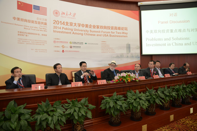 由全球CEO俱乐部与北京大学国际经济研究所,联合主办的“2014中美企业家双向投资高峰论坛”于2014年5月11日在北京大学经济学院举行。论坛主题为“中美双向投资互信共赢”,来自美国的30位CEO及150位大中华区企业家参加了本次高峰论坛,20余位嘉宾做了精彩发言及对话。